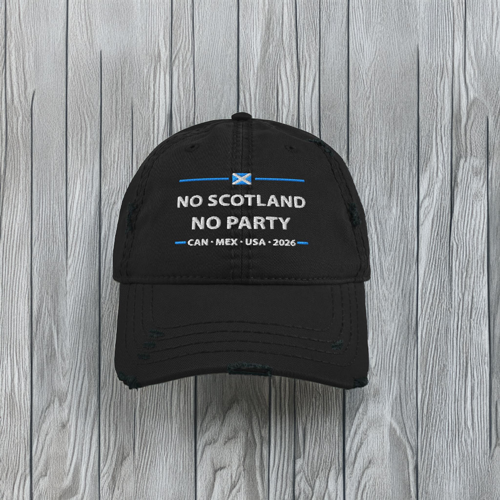• “No Scotland No Party” embroidered design with distressed finish
